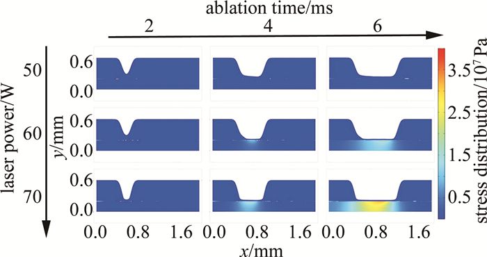 縱向觀察發(fā)現(xiàn),燒蝕時(shí)間恒定,燒蝕深度隨著激光功率的增大逐漸增大,同時(shí),燒蝕區(qū)域底部對(duì)應(yīng)的保護(hù)膠與鋁合金的結(jié)合界面處出現(xiàn)了應(yīng)力集中現(xiàn)象,而應(yīng)力集中點(diǎn)也隨著激光功率的增大而顯著增多;其中燒蝕時(shí)間為4 ms、6 ms,激光功率為60 W、70 W時(shí),保護(hù)膠與鋁合金的結(jié)合界面處開(kāi)始出現(xiàn)應(yīng)力集中現(xiàn)象,且應(yīng)力集中區(qū)隨著激光掃描路徑延伸逐漸擴(kuò)大,應(yīng)力至高點(diǎn)出現(xiàn)在掃描區(qū)域的中心位置,且對(duì)鋁合金基體材料產(chǎn)生了應(yīng)力影響。橫向觀察發(fā)現(xiàn),激光功率為50 W時(shí),整個(gè)燒蝕過(guò)程中沒(méi)有出現(xiàn)特別明顯的應(yīng)力集中區(qū),這是因?yàn)榧す夤β瘦^小時(shí),保護(hù)膠材料不能被完全燒蝕,所以保護(hù)膠與鋁合金的結(jié)合界面處并未產(chǎn)生明顯應(yīng)力;同燒蝕深度的變化規(guī)律,其應(yīng)力影響區(qū)域面積與應(yīng)力數(shù)值也隨著激光功率的增大而增大。仿真計(jì)算結(jié)果表明:激光功率越大,燒蝕深度越深;激光焦點(diǎn)距保護(hù)膠與鋁合金的結(jié)合界面處越近,界面處產(chǎn)生的應(yīng)力就越大,由于鋁合金是熱的良導(dǎo)體,較高的傳熱性能使其在激光刻型時(shí),容易產(chǎn)生更大范圍的應(yīng)力區(qū)域與更高的應(yīng)力值。