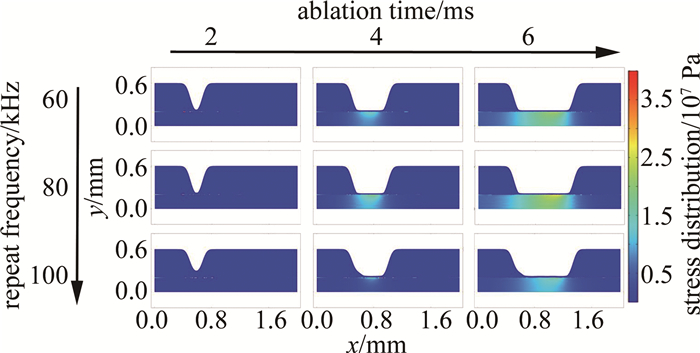 圖 4是以激光重復(fù)頻率為變量的仿真結(jié)果。選取60 kHz, 80 kHz, 100 kHz為參數(shù)節(jié)點(diǎn),其余仿真條件如下:激光功率為60 W、掃描速率為10 m/min。燒蝕時(shí)間節(jié)點(diǎn)選擇與圖例設(shè)置同圖 2。觀察發(fā)現(xiàn), 激光重復(fù)頻率為60 kHz, 80 kHz時(shí),燒蝕過(guò)程中產(chǎn)生的應(yīng)力區(qū)域與應(yīng)力值差別較小但顯著大于重頻為100 kHz時(shí)的情況。3種重頻下的燒蝕深度并無(wú)明顯差別,說(shuō)明在激光功率與掃描速率相同的情況下,脈沖激光的重復(fù)頻率對(duì)燒蝕效果的影響并不顯著,但卻會(huì)帶來(lái)燒蝕過(guò)程中應(yīng)力的變化,這對(duì)調(diào)整激光加工工藝有重要的指導(dǎo)意義。