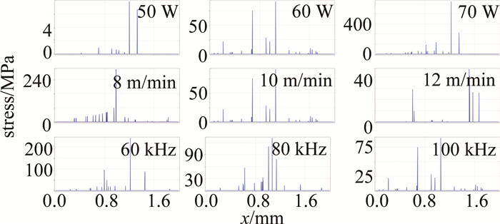 (2) 應(yīng)力極值與激光功率呈正相關(guān),與掃描速率和重復(fù)頻率呈負(fù)相關(guān),其中激光功率對(duì)應(yīng)力極值的影響較為顯著。由于鋁合金是熱的良導(dǎo)體,較高的傳熱性能使其在激光刻型時(shí),更易產(chǎn)生大范圍的應(yīng)力區(qū)域與更高的應(yīng)力值。