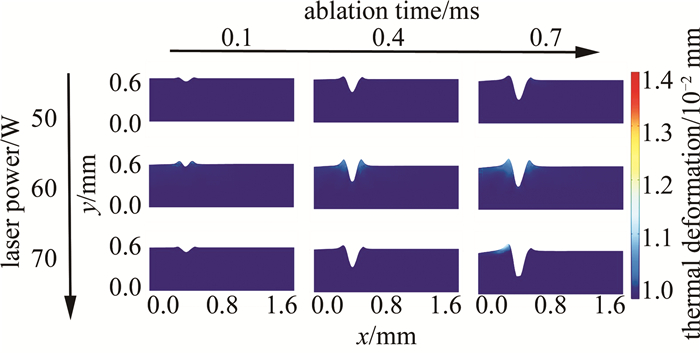 圖 6為不同激光功率對(duì)保護(hù)膠刻型形貌的影響示意圖。以激光功率為變量,分別選取50 W, 60 W, 70 W為參數(shù)節(jié)點(diǎn),根據(jù)激光燒蝕時(shí)間選擇3個(gè)時(shí)間節(jié)點(diǎn)分別為0.1 ms, 0.4 ms, 0.7 ms。在9個(gè)仿真結(jié)果中,材料因熱應(yīng)力而產(chǎn)生的位移通過(guò)顏色圖例顯示,至高為1.4×10-2 mm,低為0.98×10-2 mm。